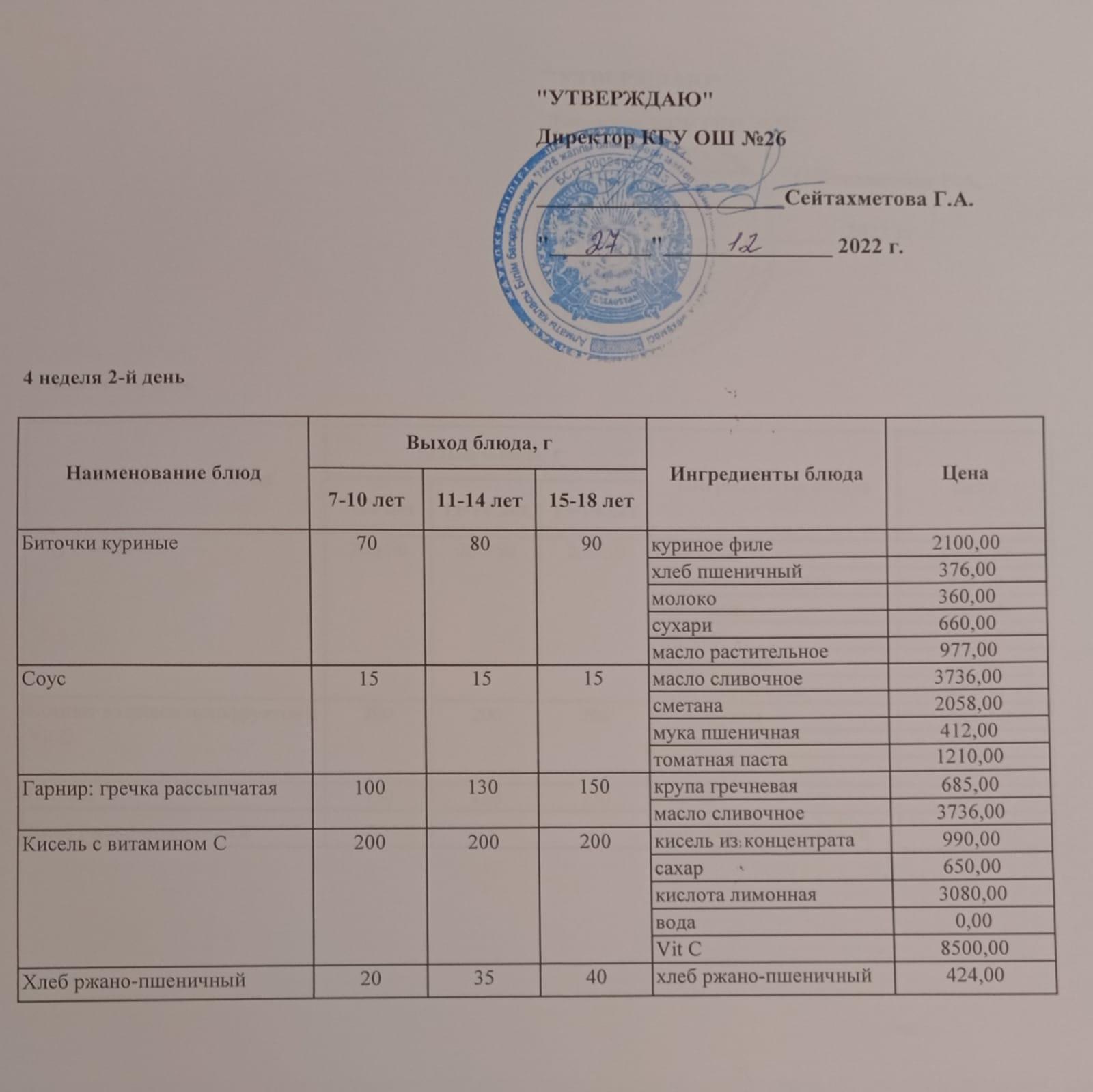 Төрт апталық ас мәзірінің IV-аптасының 2-күні (27.12.2022)