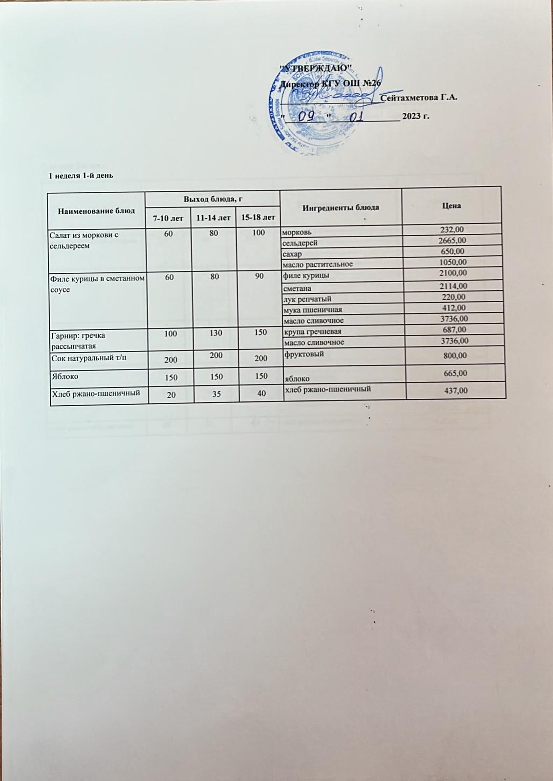 Төрт апталық ас мәзірінің I-аптасының 1-күні (09.01.2023)