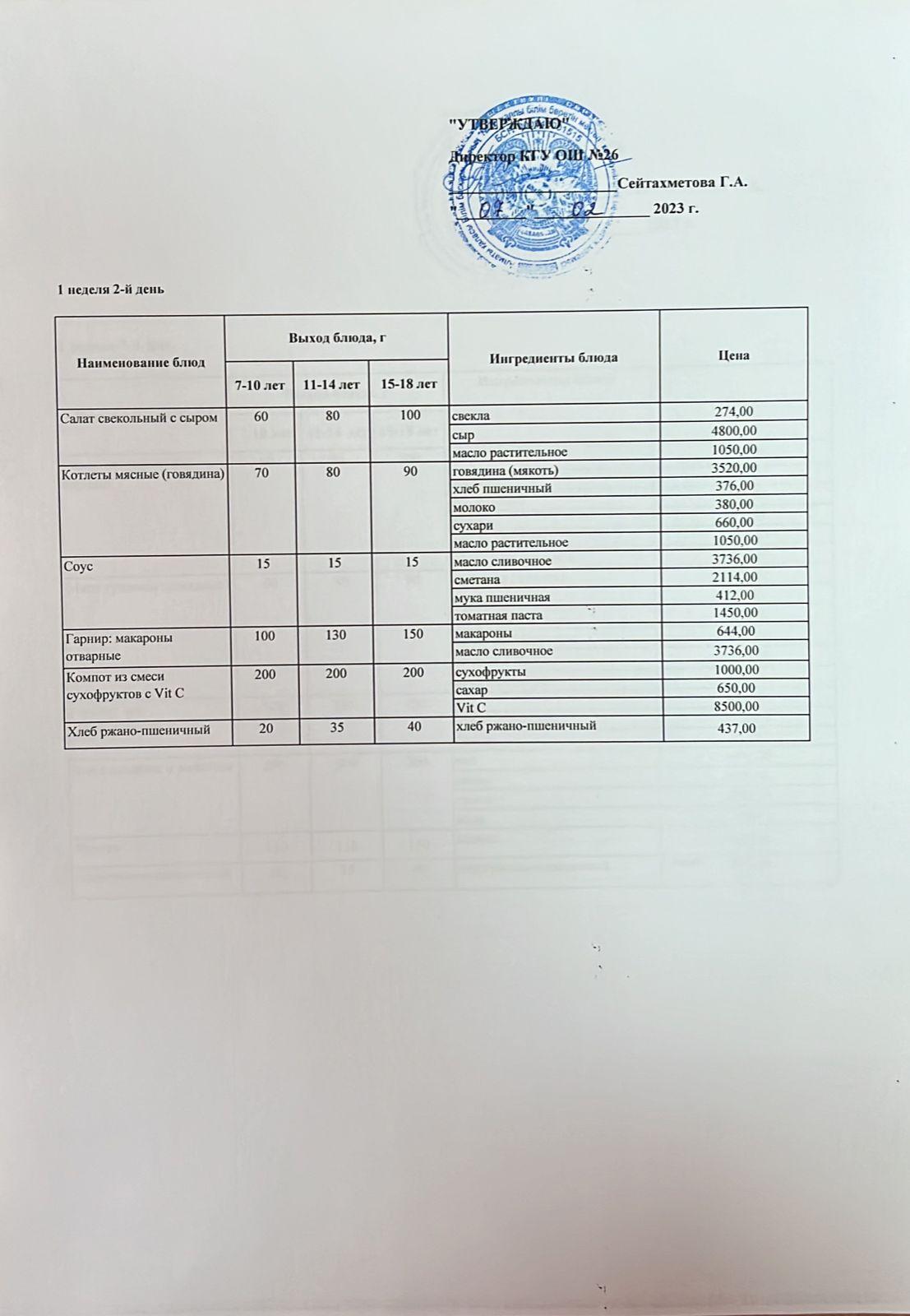 Төрт апталық ас мәзірінің І-аптасының 2-күні (07.02.2023)