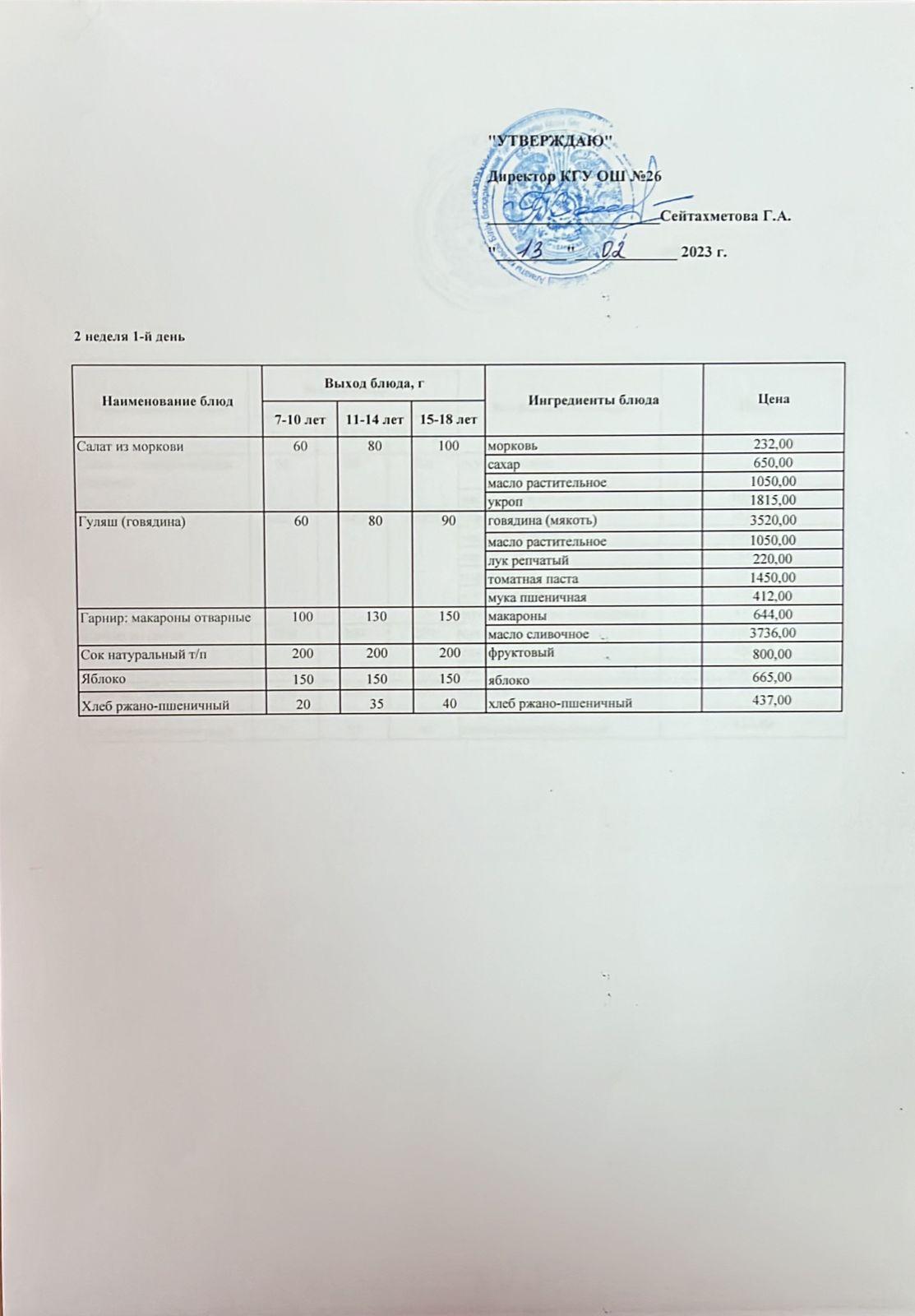 Төрт апталық ас мәзірінің ІІ-аптасының 1-күні (13.02.2023)