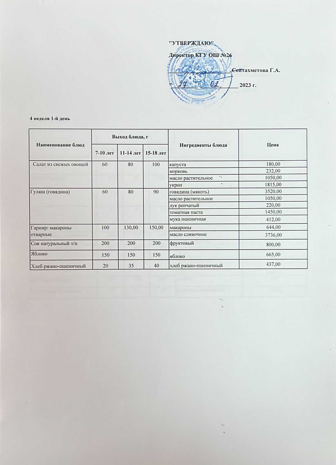Төрт апталық ас мәзірінің ІV-аптасының 1-күні (27.02.2023)