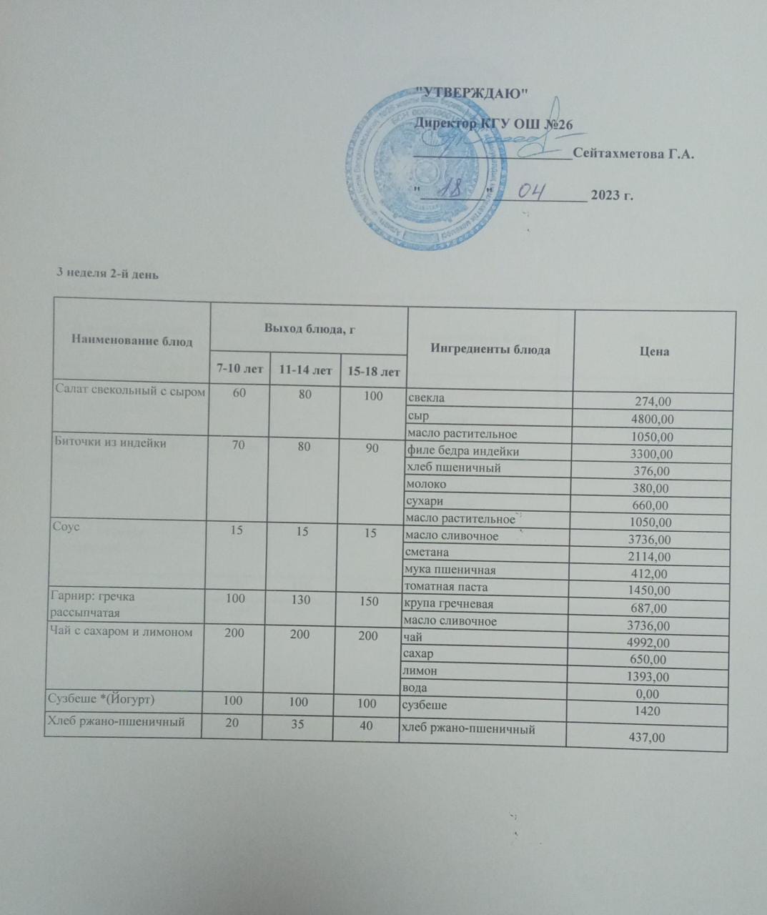 Төрт апталық ас мәзірінің III-аптасының 2-күні (18.04.2023)