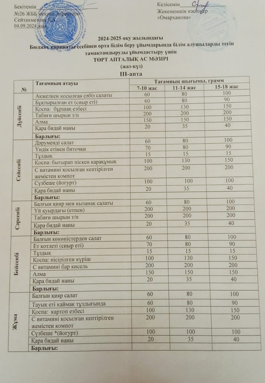 » Төрт апталық ас мәзірінің /жаз-күз/ - III аптасы 2024-2025 оқу жылы