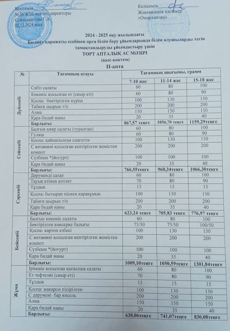 Төрт апталық ас мәзірінің /жаз-күз/ - II аптасы 2024-2025 оқу жылы