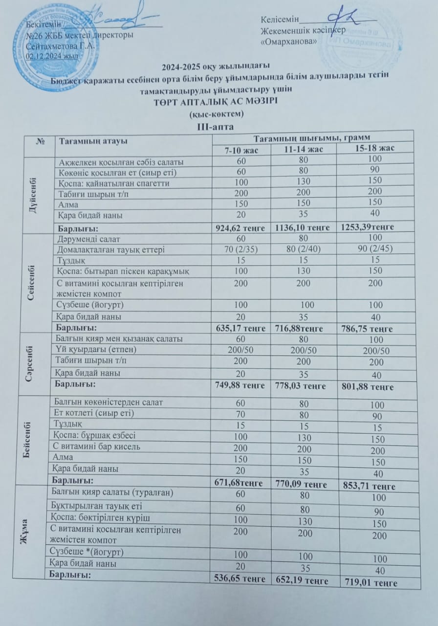 Төрт апталық ас мәзірінің /қыс-көктем/ - IІI аптасы 2024-2025 оқу жылы