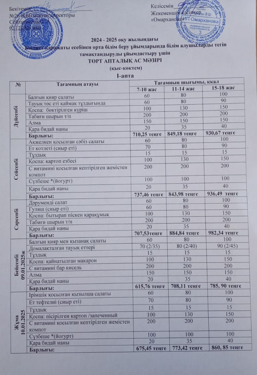 » Ас мәзірі І апта - 09-10. 01.2025ж