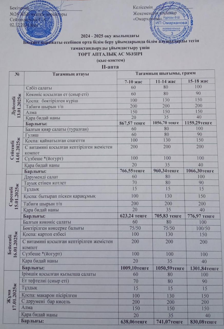» Ас мәзірі ІІ апта - 13-17. 01.2025ж