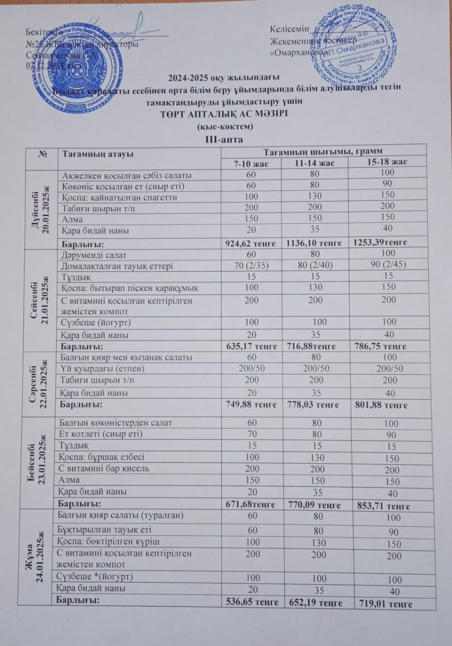 » Ас мәзірі ІІІ апта - 20-24. 01.2025ж