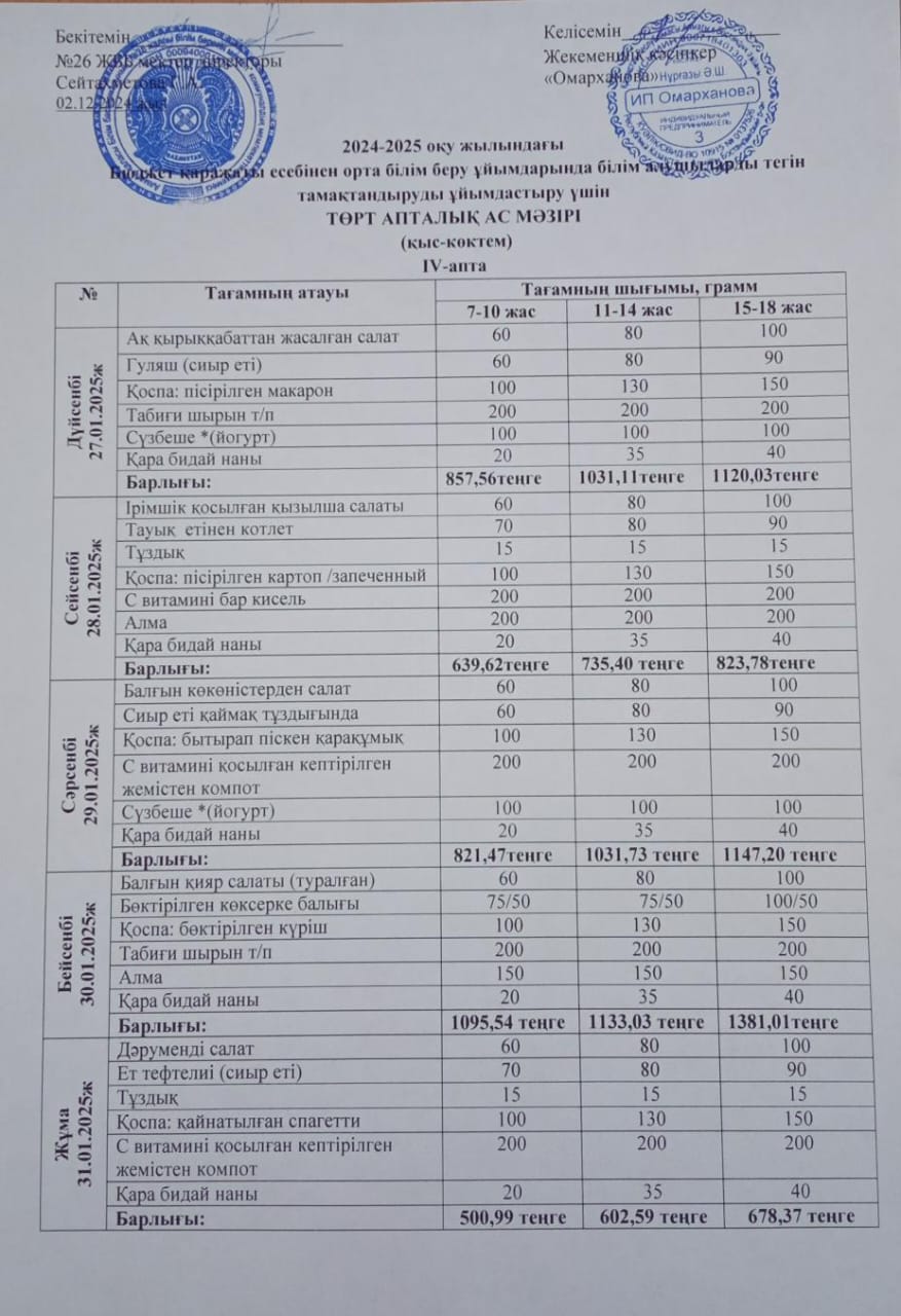 Ас мәзірі ІV апта - 27-31. 01.2025ж