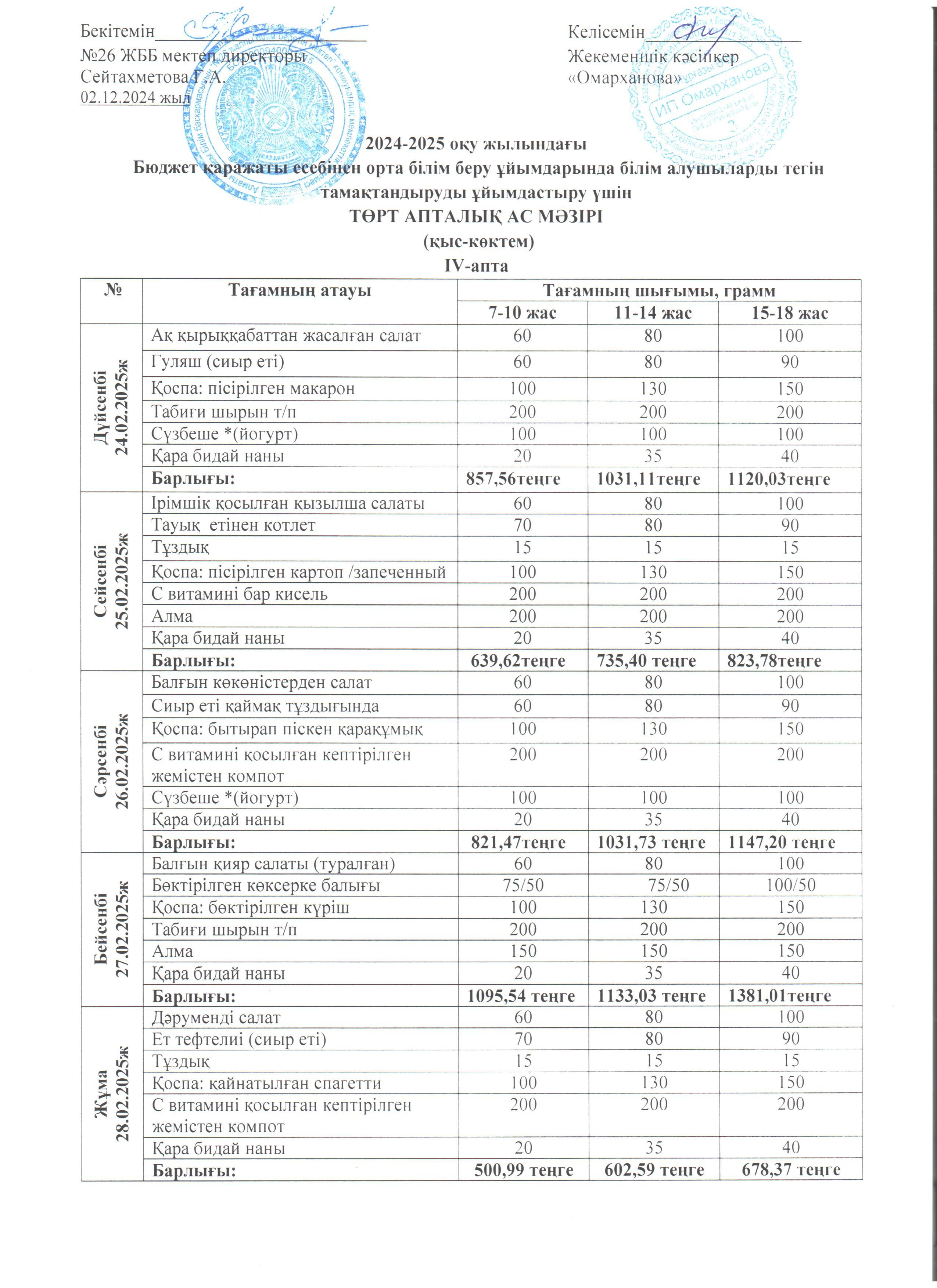 » Ас мәзірі ІV апта 24.02.- 28.02.2025ж