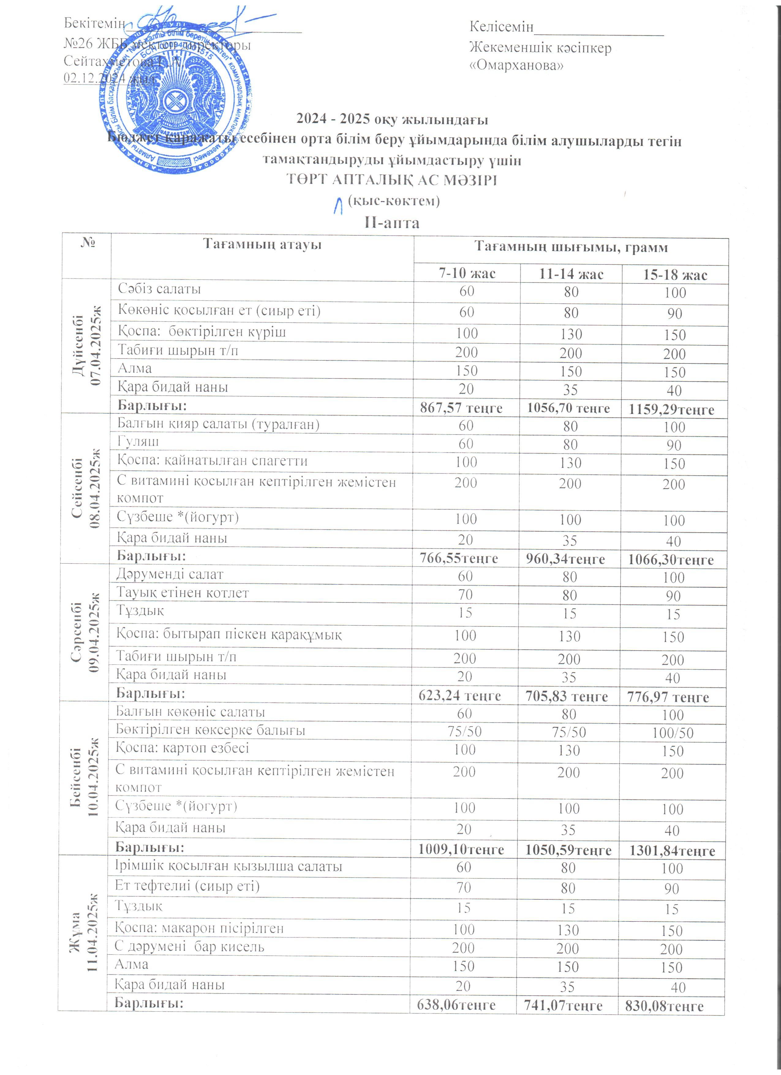 Ас мәзірі ІІ апта 07.04. - 11.04.2025ж.