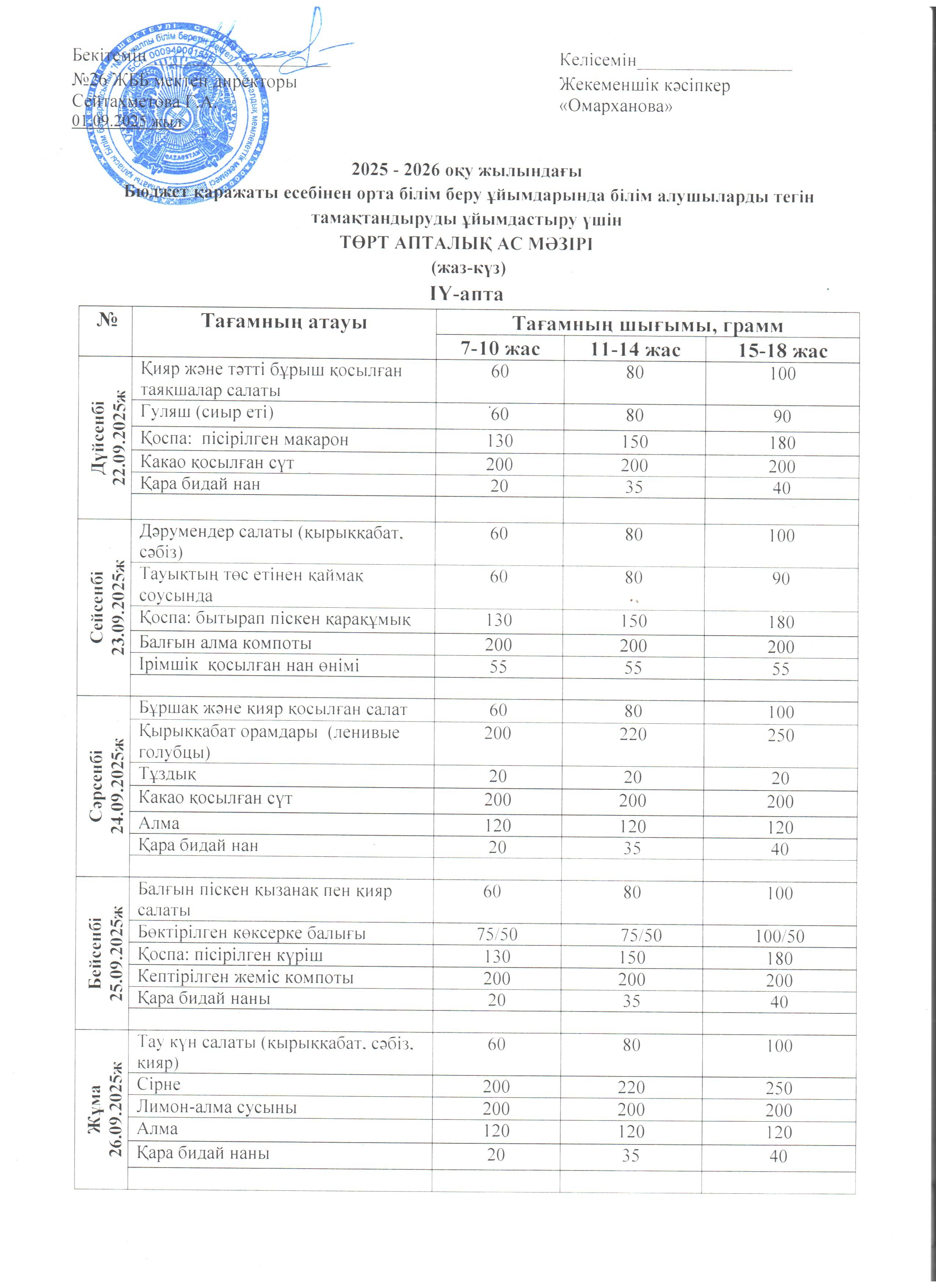 Ас мәзірі ІV апта 22.09. - 26.09.2025ж.