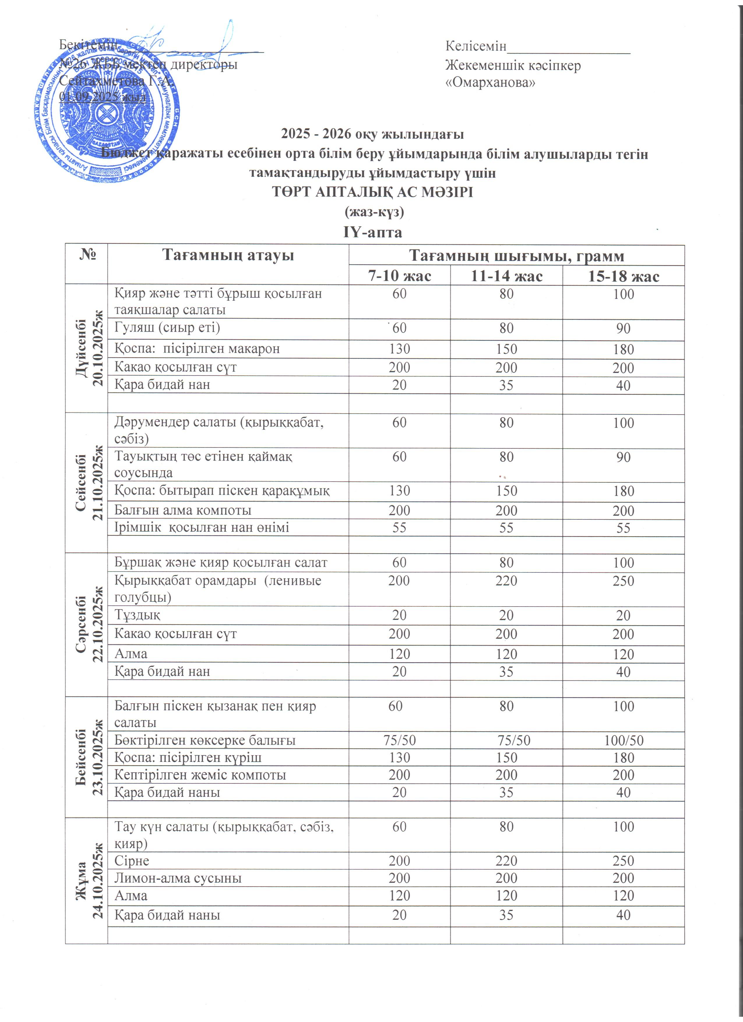 Ас мәзірі ІV апта 20.10 - 24.10.2025ж.