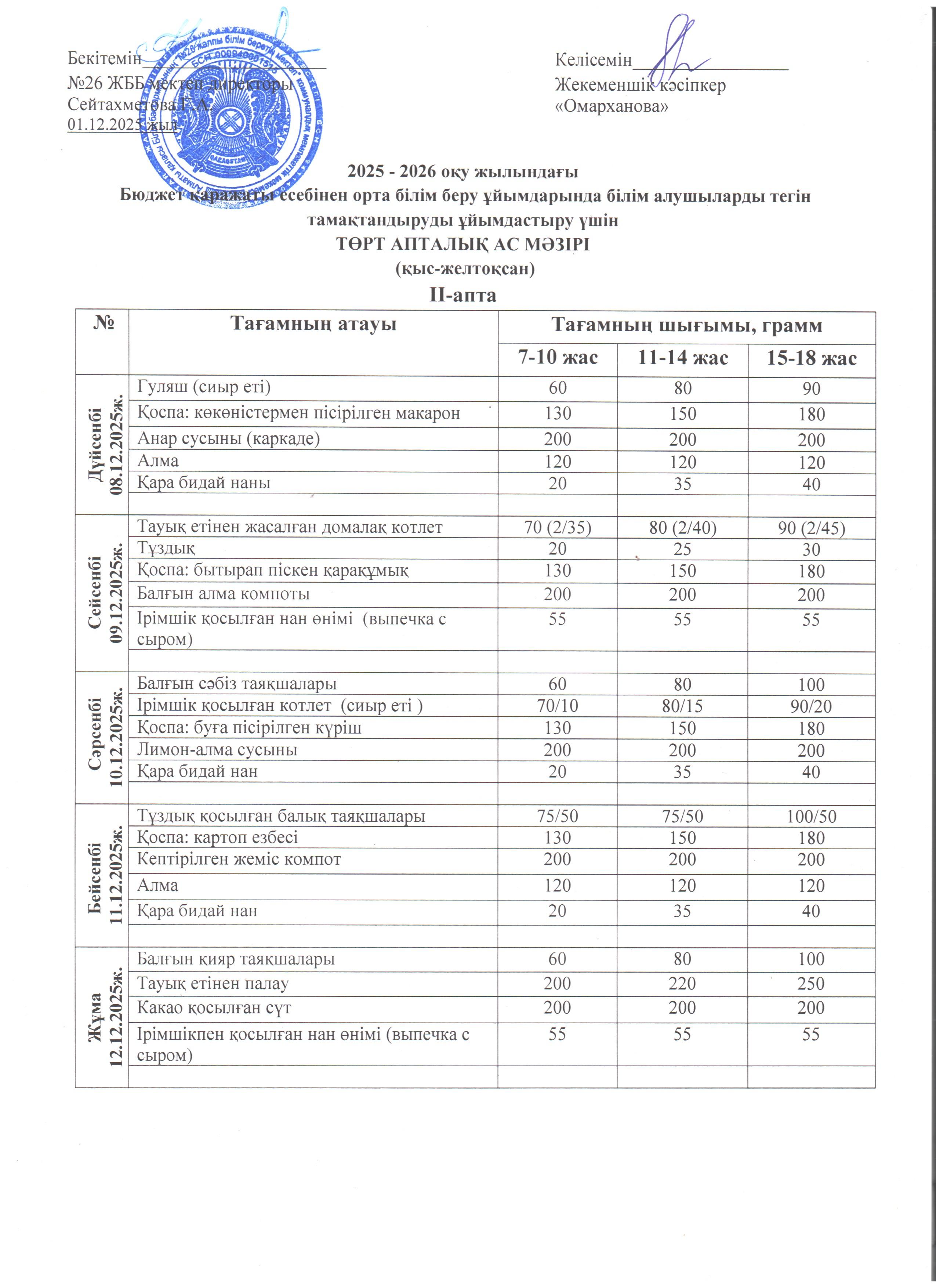 Ас мәзірі II апта 08.12 - 12.12.2025ж.
