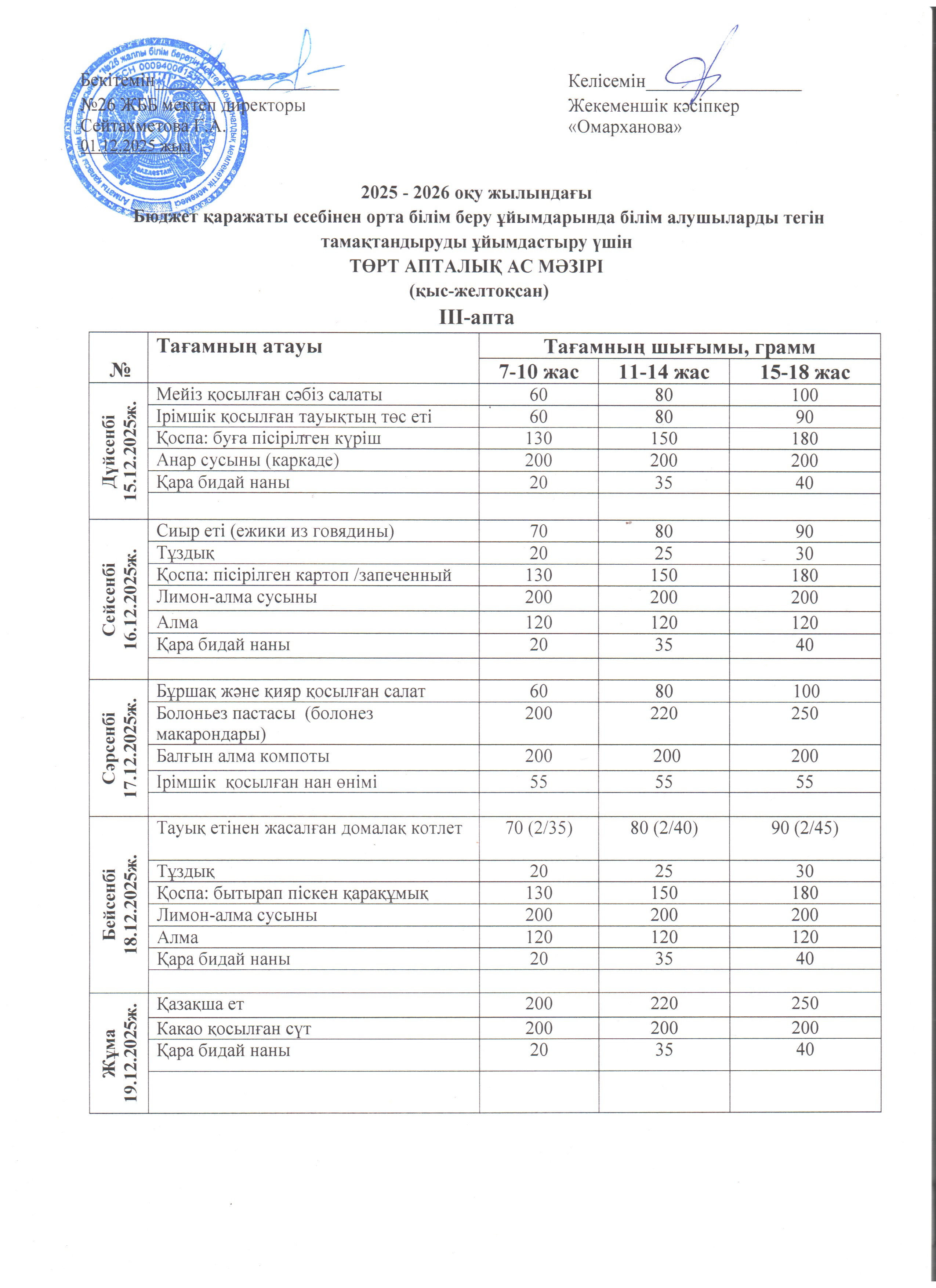 Ас мәзірі III апта 15.12 - 19.12.2025ж.