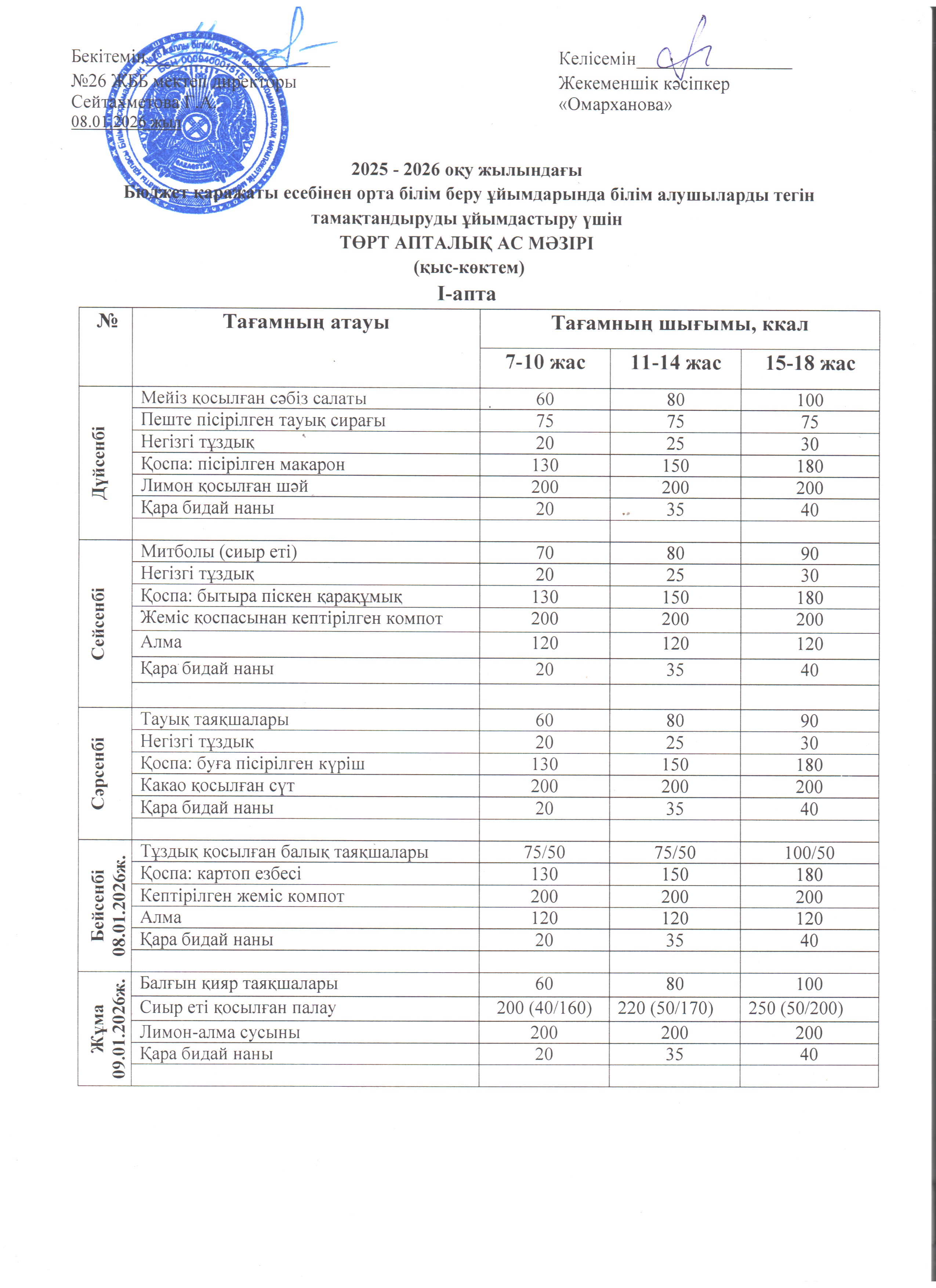 » Ас мәзірі I апта 08.01. - 09.01.2026ж.