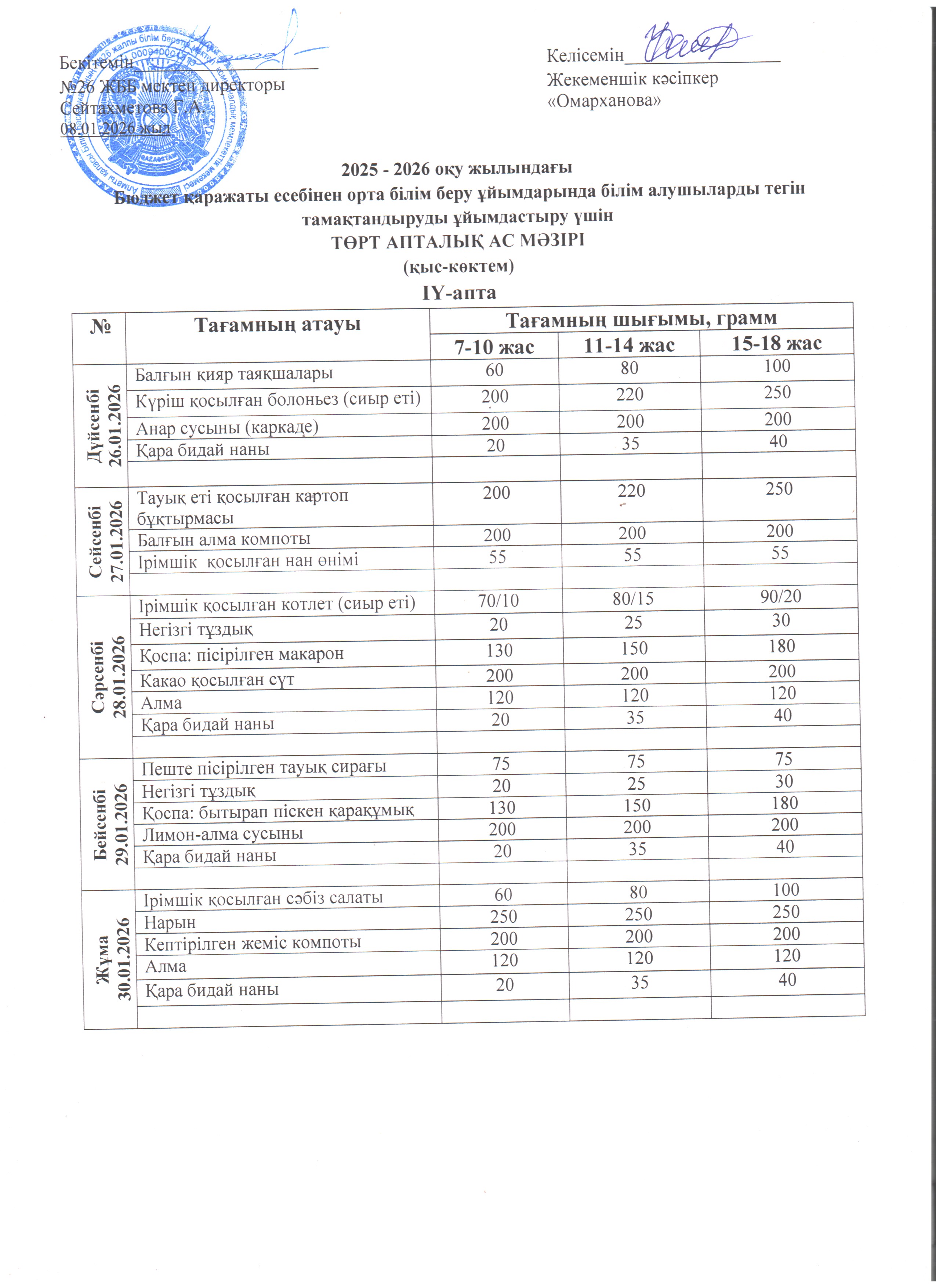 Ас мәзірі IV апта 26.01. - 30.01.2026ж.