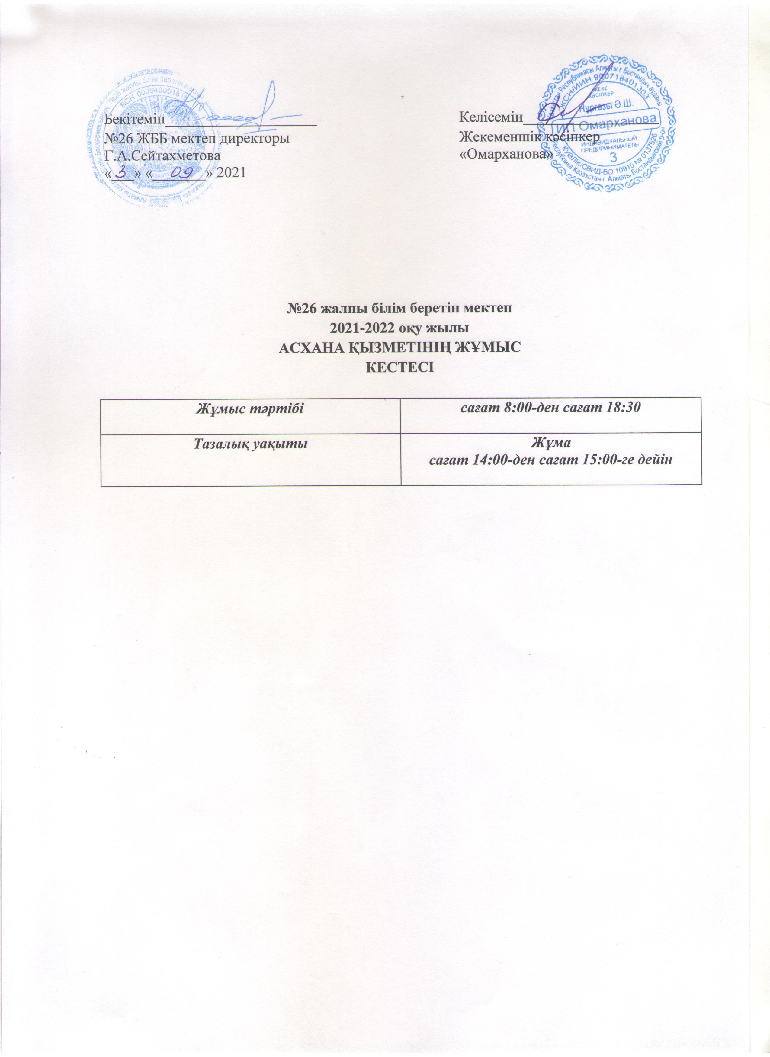 Асхананың жұмыс кестесі 2021-2022 оқу жылы